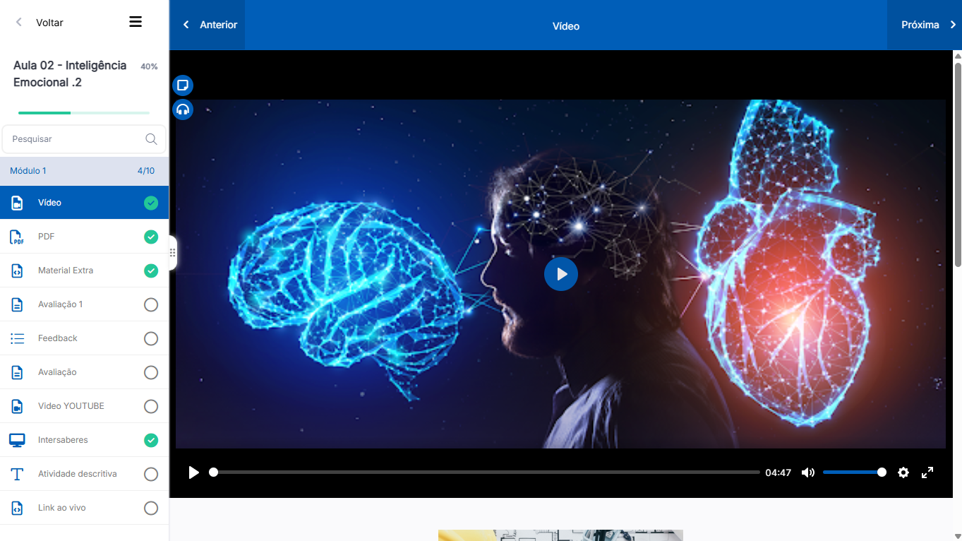 - Área do aluno, plataforma EAD, tudo personalizado com a sua marca e padrão de cores, acessível, e conectado em tempo real